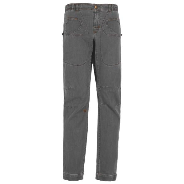 Pantaloni outdoor e arrampicata in tessuto denim. Cintura interna con nastro elastico E9. Passante per cintura.Patch sul retro. Ricamo sul davanti. Buon conforto. Vestibilità regolare. Fatto in Italia.