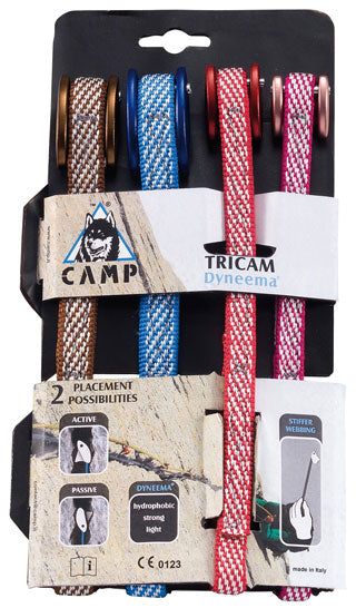 I Tricam delle misure più usate (0.5, 1.0, 1.5, 2.0) provvisti di fettuccia in Dyneema® e quindi più resistenti in caso di piazzamento attivo. Il Dyneema® è superiore al nylon in condizioni di forte umidità: se bagnato mantiene un carico di rottura più alto e, grazie alle sue proprietà idrorepellenti, impedisce alla fettuccia di assorbire acqua e di gelare.