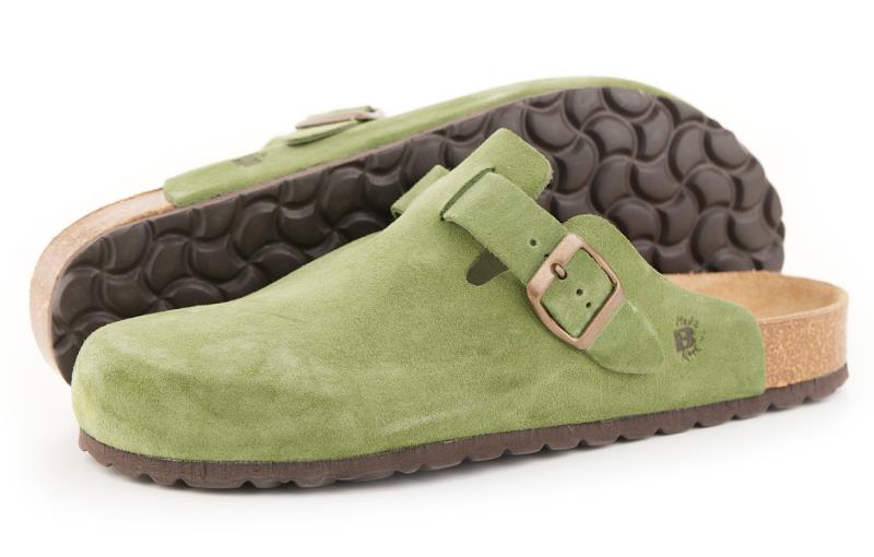 Sabot con tomaia in pelle crosta bovina scamosciata lavorato senza cuciture. Regolabile, con cinturino dotato di fibbia in metallo.